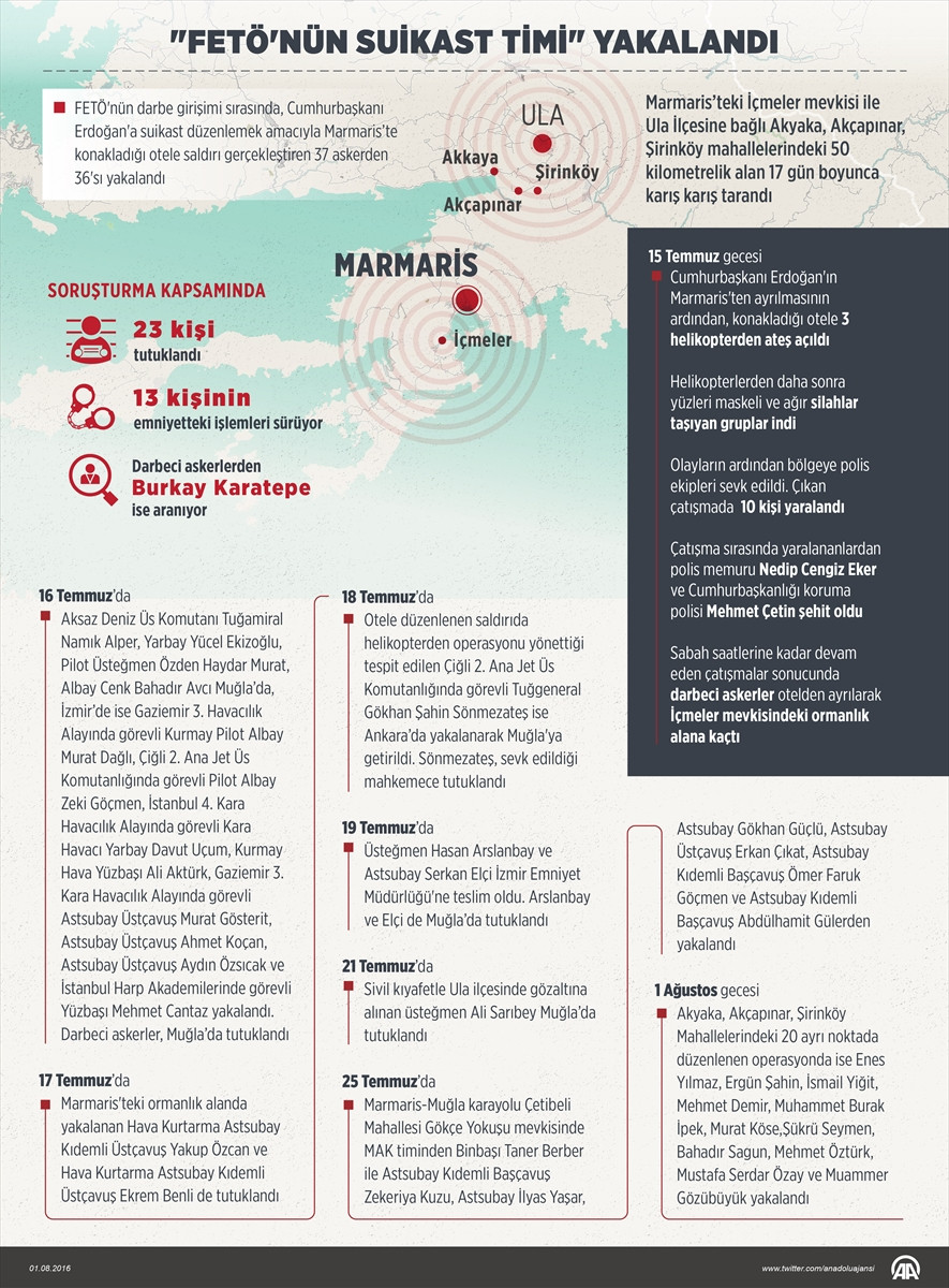 Cumhurbaşkanı Erdoğan'ın Muğla'nın Marmaris ilçesinde kaldığı otele saldırıda bulunan darbeci askerlerin sayısının 37 olduğu açıklanmıştı. Operasyonlar sonucu gözaltına alınan 36 askerden 23'ü çıkarıldıkları mahkemece tutuklanmıştı, 13'ünün emniyetteki işlemleri sürüyor.
