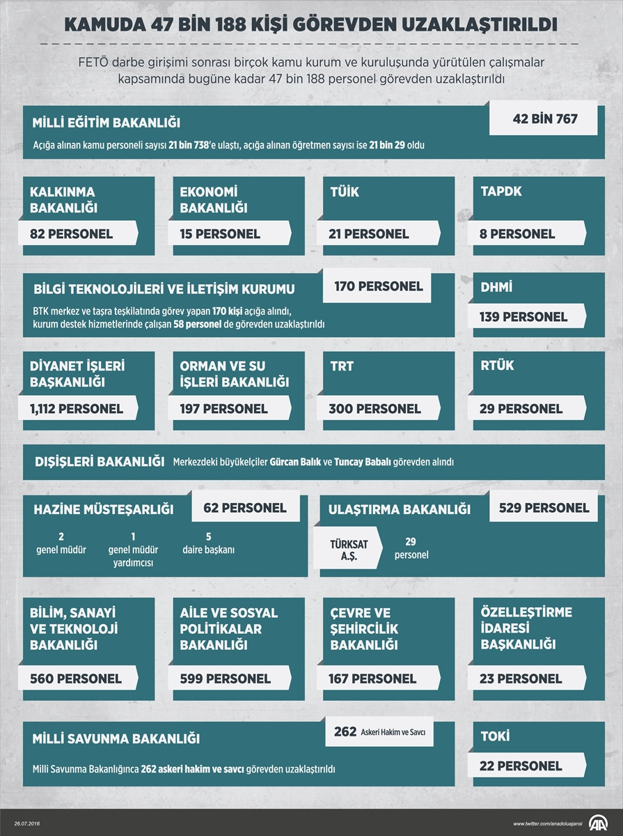 ANKARA (AA) - Fetullahçı Terör Örgütü'nün (FETÖ) darbe girişimi sonrası birçok kamu kurum ve kuruluşunda yürütülen çalışmalar kapsamında 47 bin 188 personel görevden uzaklaştırıldı.AA muhabirinin derlediği bilgiye göre, Başbakanlık, Dışişleri Bakanlığı, Kalkınma Bakanlığı, Diyanet İşleri Başkanlığı, Aile ve Sosyal Politikalar Bakanlığı, Bilim, Sanayi ve Teknoloji Bakanlığı...