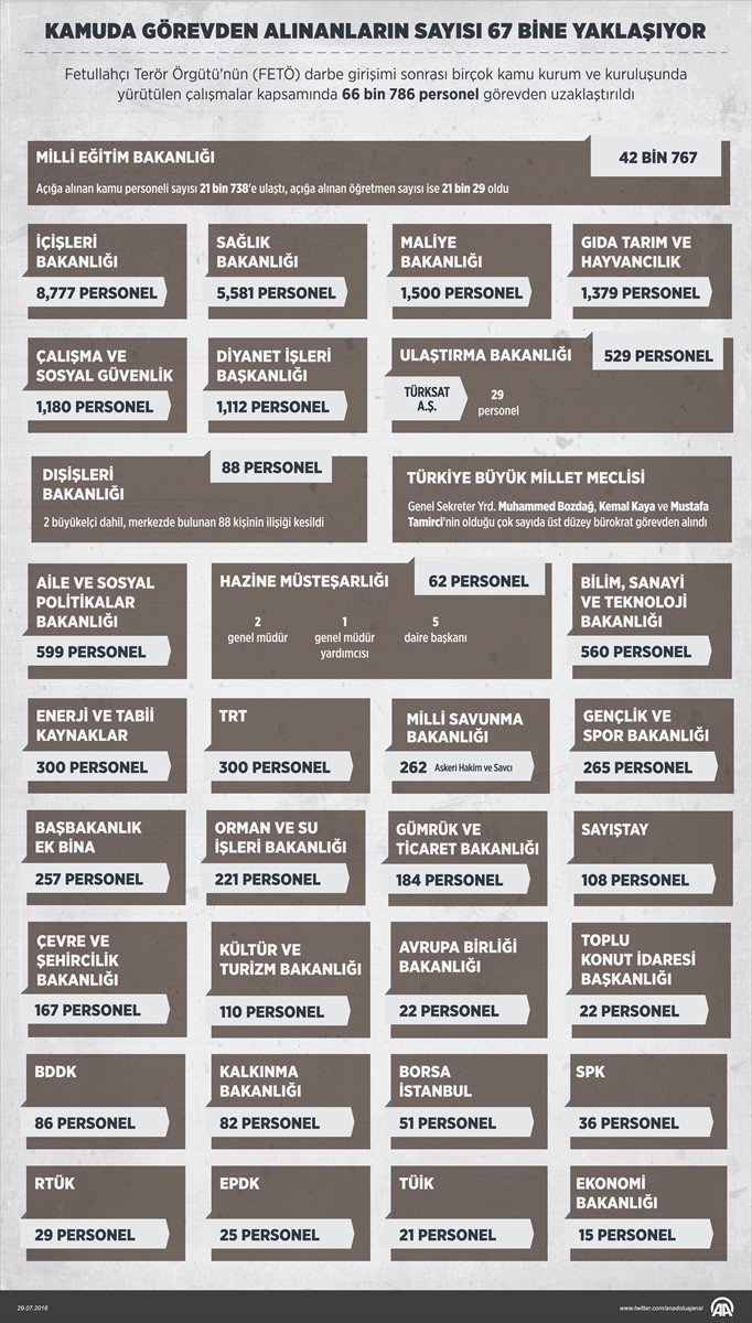 ANKARA (AA) - Fetullahçı Terör Örgütü'nün (FETÖ) darbe girişimi sonrası birçok kamu kurum ve kuruluşunda yürütülen çalışmalar kapsamında 66 bin 786 personel görevden uzaklaştırıldı. Çalışma ve Sosyal Güvenlik Bakanlığı başta olmak üzere ekonomiyle ilgili kurum ve kuruluşlarda ise 15 Temmuz'dan bugüne kadar 6 bin 147 personel açığa alındı.
