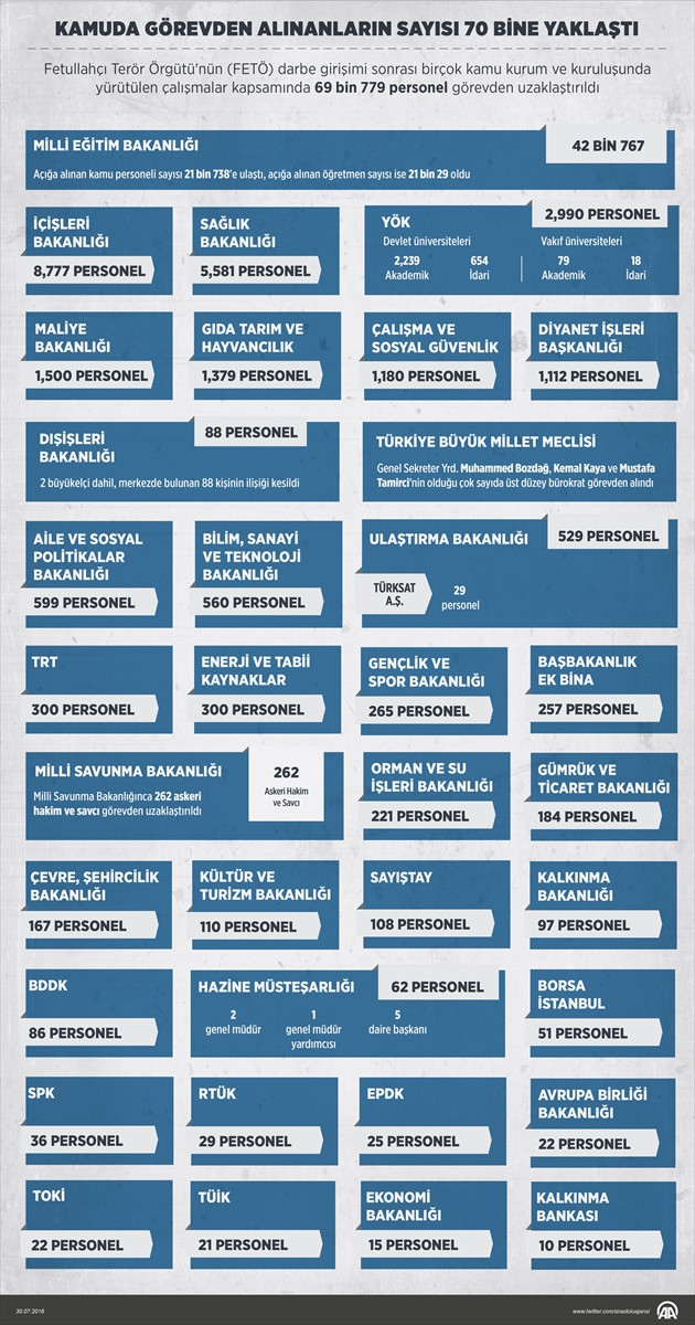 ANKARA (AA) - Fetullahçı Terör Örgütü'nün (FETÖ) darbe girişimi sonrası birçok kamu kurum ve kuruluşunda yürütülen çalışmalar kapsamında 69 bin 779 personel görevden uzaklaştırıldı. Başta Çalışma ve Sosyal Güvenlik Bakanlığı olmak üzere ekonomiyle ilgili kurum ve kuruluşlarda ise 15 Temmuz'dan bugüne kadar 6 bin 172 personel açığa alındı.