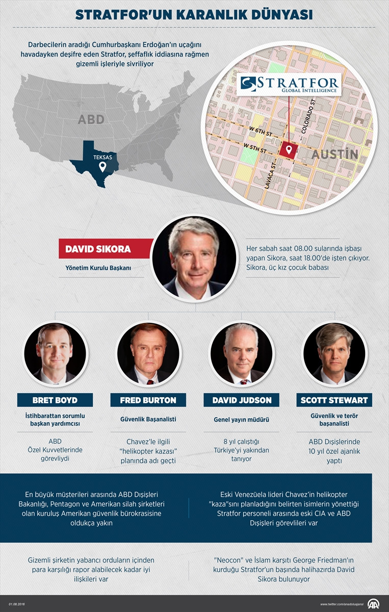 ANKARA (AA) – Fetullahçı Terör Örgütü'nün (FETÖ) 15 Temmuz'daki darbe girişimi esnasında Cumhurbaşkanı Recep Tayyip Erdoğan'ın uçağının lokasyonuyla ilgili 3 kez paylaşımda bulunarak dikkatleri üzerine çeken ABD'nin özel istihbarat örgütü Stratfor, kuruluşu, çalışma yöntemleri ve topladığı istihbaratlarla oluşturduğu raporlarla dünyada tartışılmaya devam ediyor.