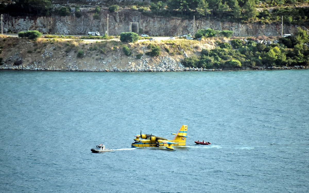 Orman yangına müdahale eden uçaklardan yangın söndürme uçaklarından biri, deniz yüzeyinden su aldığı esnada arızalandı.