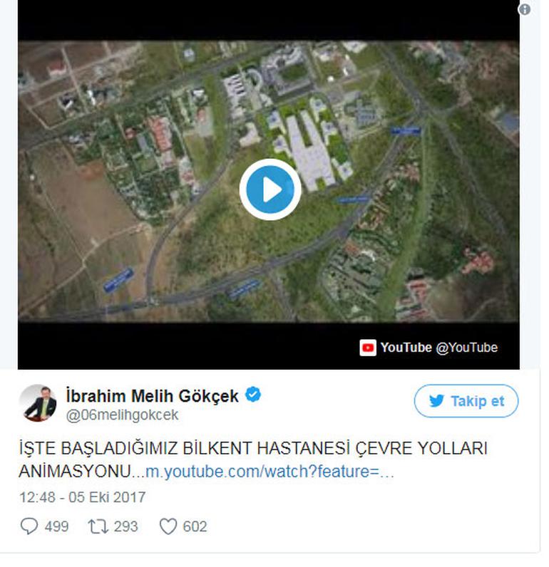 Gökçek, bu konuşmadan sonra Twitter'da Bilkent'te yapılan çevre yollarıyla ilgili bir animasyon paylaştı.