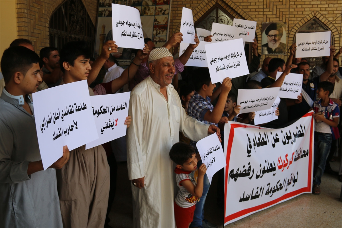 Sadr Hareketi Kerkük Temsilciliğinde bir araya gelen Şii lider Muktada es-Sadr yanlısı onlarca kişi, kentteki Hazal Timimi Camisi'nde kıldıkları cuma namazının ardından düzenledikleri gösteride hükümetin yolsuzlukla ilgili politikalarını protesto etti.