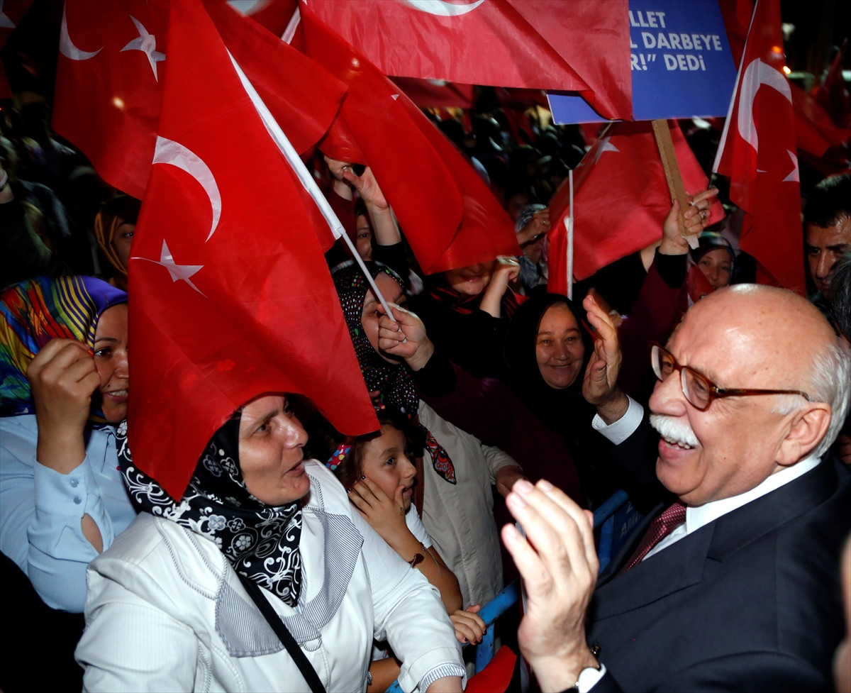 "Hepimiz gündüz işimizde gücümüzdeyiz. Sabah işimize gidiyoruz, evlerde ev hanımlarımız işlerini yapıyorlar, akşamları da bütün Türkiye nöbete geliyor elhamdülillah. Zor zamanlardan geçiyoruz ama çok şükür kitlenin beli kırıldı. Uyanık olmak zorundayız. Hepiniz büyüklerinizden duymuşsunuzdur. Su uyur, düşman uyumaz. Onun için ayaktayız, nöbetteyiz. Ne zamana kadar, Başkomutan, Cumhurbaşkanımız, 'Teşekkür ederim, nöbetlerimizi bitirdik diyene kadar buradayız. Bu sadece bir kalkışma, bir darbe teşebbüsü değil. Bu aslında Türkiye'ye diz çöktürme operasyonuydu. Pek çok yabancı bağlantıları olan, farklı istihbarat birimleri tarafından kullanılan Fetullahçı Terör Örgütü, Türkiye'ye ye diz çöktürtmek isteyenlerin aleti olarak bu senaryoları ortaya koydu ama millet bir bütün halinde ayağa kalktı ve 'dur' dedi. Türkiye'ye diz çöktürtmek isteyen düşmanlara da geçit yok dedi, elhamdülillah."