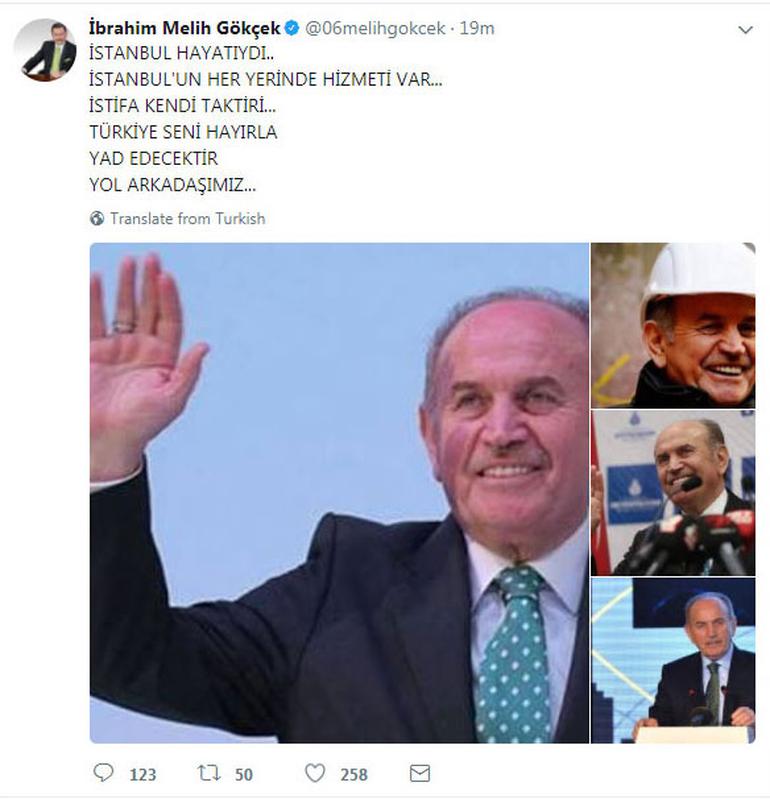 "İSTANBUL HAYATIYDI.. İSTANBUL'UN HER YERİNDE HİZMETİ VAR... İSTİFA KENDİ TAKTİRİ... TÜRKİYE SENİ HAYIRLA YAD EDECEKTİR YOL ARKADAŞIMIZ..."
