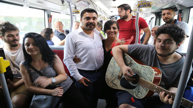 Zincirlikuyu-Avcılar arasında sefer yapan metrobüse binen müzisyenler teklif için metrobüste hazırlandı.