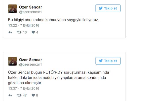 ''Bu bilgiyi onun adına kamuoyuna saygıyla iletiyoruz. Özer Sencar bugün FETÖ/PDY soruşturması kapsamında hakkındaki bir iddia nedeniyle yapılan arama sonrasında gözaltına alınmıştır.''