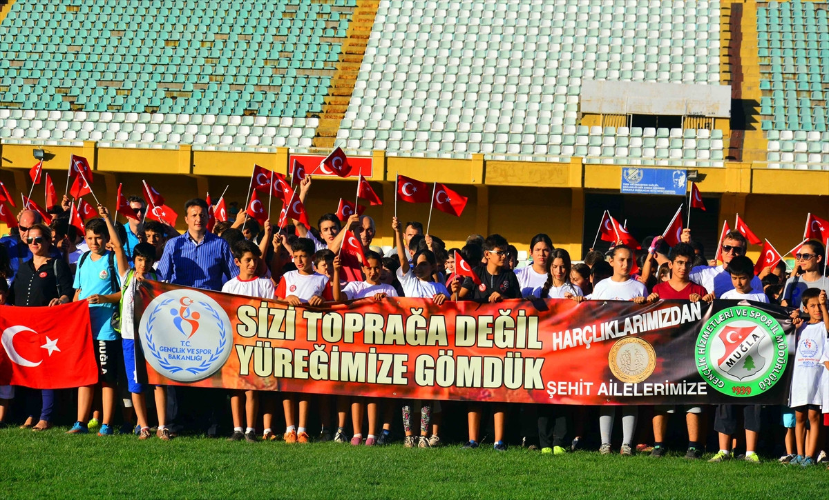 Muğla Atatürk Stadyumunda düzenlenen programda yaz kurslarında eğitim gören 5-12 yaşlarındaki yaklaşık 500 çocuk ve aileleri bir araya geldi.
