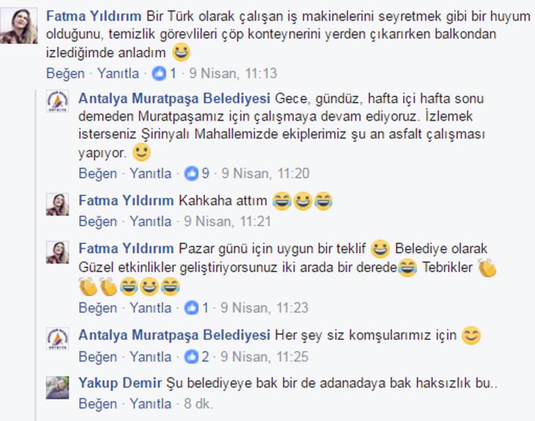Antalya’nın en fazla nüfusa sahip 2’inci ilçesi Muratpaşa’da ikamet eden Fatma Yıldırım isimli vatandaşın Facebook'tan paylaştığı yoruma Muratpaşa Belediyesi'nin verdiği yanıt sosyal medyanın gündemine oturdu...