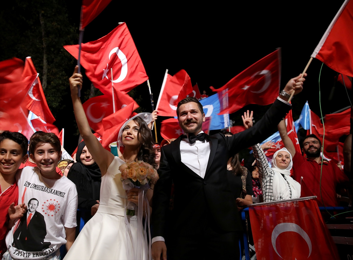 İSTANBUL (AA) - EMRAH GÜNEY - İstanbul'da yeni evlenen bir çift, Fetullahçı Terör Örgütü'nün (FETÖ) darbe girişimine tepki amacıyla birçok meslek ve yaş grubundan kişinin tuttuğu "demokrasi nöbeti"ne, Cumhurbaşkanı Recep Tayyip Erdoğan'ın evinin bulunduğu Kısıklı'da katıldı.