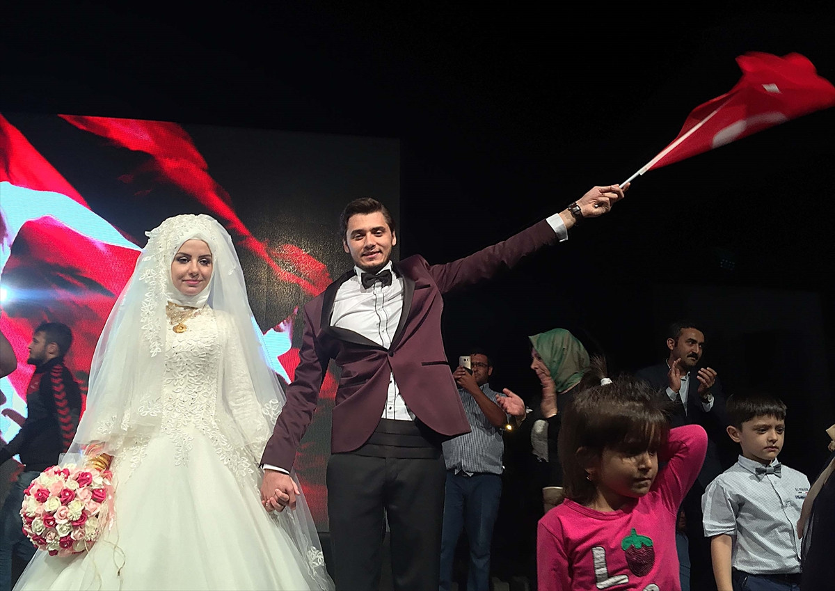 Sahneye davet edilen Yeğin çifti, ellerinde Türk bayraklarıyla vatandaşları selamladı. Vatandaşlar, gelin ve damatla fotoğraf çektirdi.