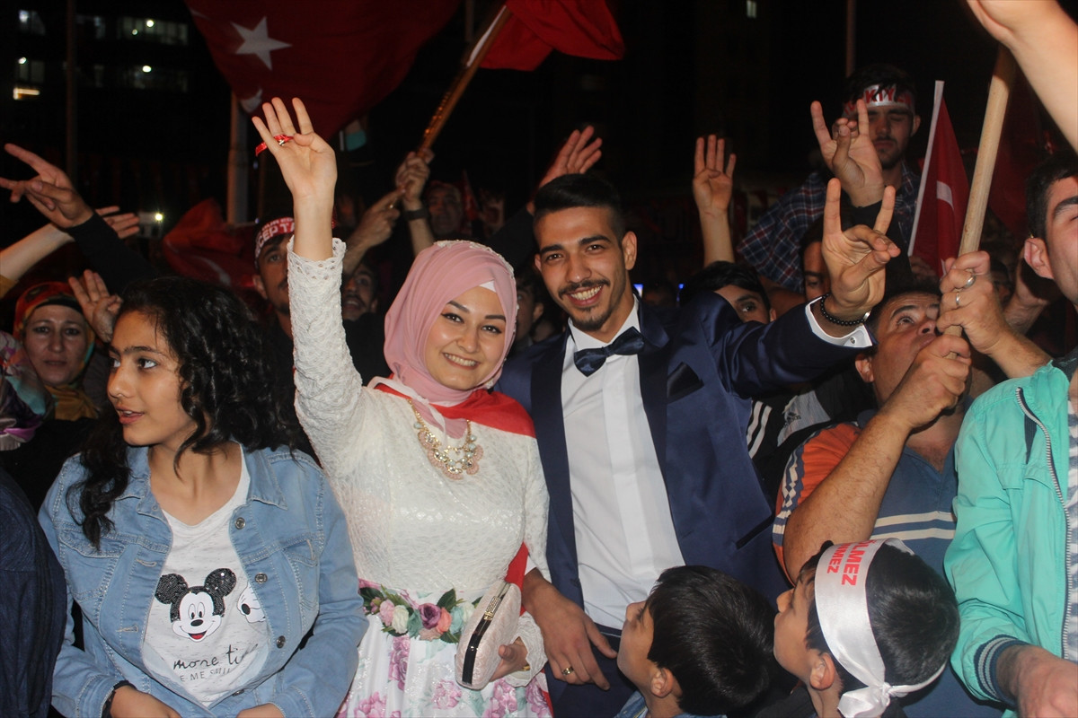 Düğünleri yapılan Mehmet ve Büşra Demirci çifti, darbe girişimini protesto etmek için düğün merasiminin ardından meydana geldi.