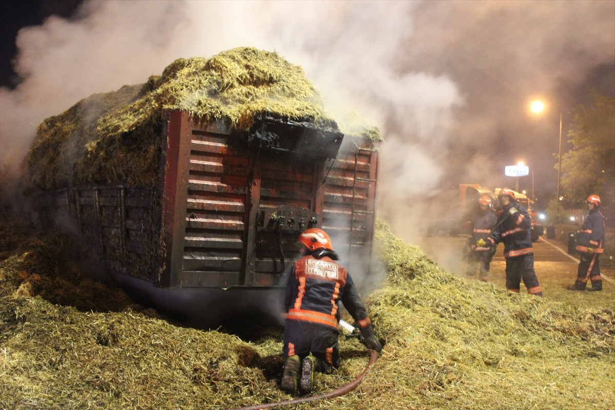 Aracını park ettikten bir süre sonra samanların yandığını fark eden Tüzün, hemen tırı dorseden ayırıp durumu itfaiyeye bildirdi.
