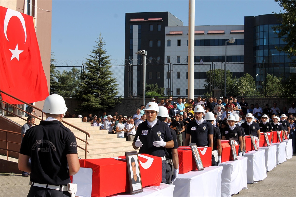 BİNGÖL (AA) - Bingöl'de, terör örgütü PKK mensubu teröristlerce yol kenarına park edilen bomba yüklü aracın infilak ettirildiği terör saldırısında şehit olan 7 polis memuru için Bingöl'de tören düzenlendi.