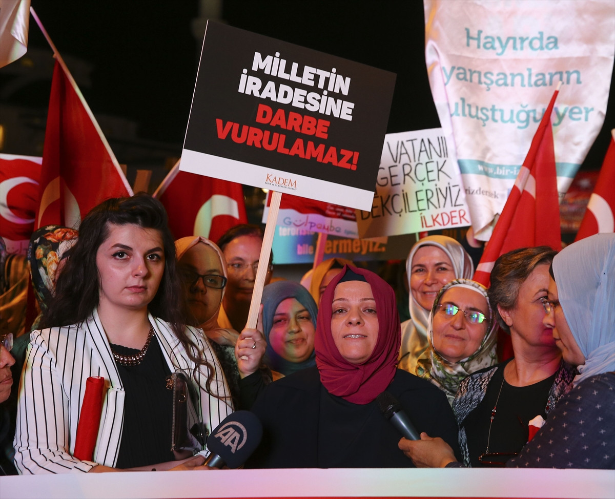 Birlik Vakfı Ankara Kadın Kolları Başkanı Çiğdem Maviş, Cumhurbaşkanlığı Külliyesi önünde, platform adına yaptığı açıklamada, darbe girişimini kınadıklarını belirterek, darbe girişiminin milli iradelerine sahip çıkan vatandaşlar, polisler ve askerler tarafından bozguna uğratıldığını anımsattı.