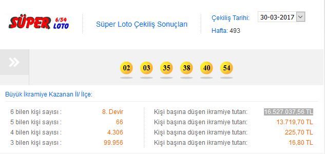 Milli Piyango İdaresi Genel Müdürlüğü tarafından düzenlenen Süper Loto oyununun 493'üncü hafta çekilişi yapıldı. Çekiliş sonucu bu haftanın kazandıran numaraları 2, 3, 35, 38, 40 ve 54 olarak belirlendi. Çekiliş sonuçları itibarıyla 6 bilen çıkmayınca on altı milyon beş yüz yirmi yedi bin otuz yedi lira elli altı kuruş (16.527.037,56 TL) haftaya devretti.