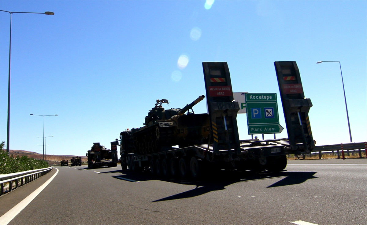 Gaziantep 5. Zırhlı Tugay Komutanlığından çıkış yapan tank ve zırhlı personel taşıyıcı yüklü 4 tır, Suriye sınırındaki Karkamış ilçesine hareket etti.