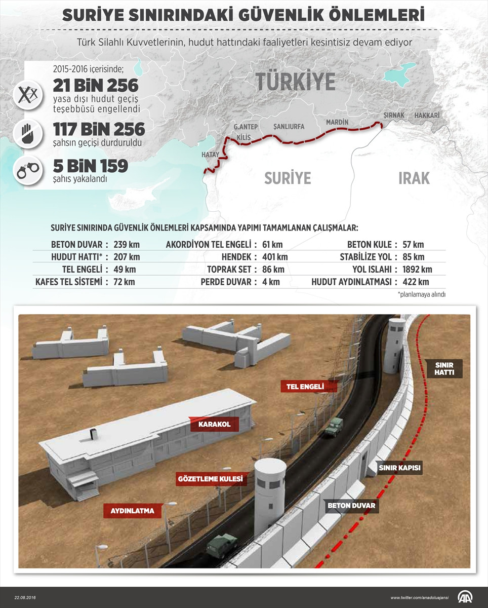 Bu kapsamda, son üç yıllık süreçte Suriye hududunda, 239 kilometre modüler sabit beton duvar kurulumu tamamlandı, 207 kilometrelik bir hudut hattı da planlamaya alındı. Ayrıca 49 kilometre tel engeli, 72 kilometre kafes tel engel sistemi, 61 kilometre akordiyon tel engel sistemi tamamlandı. Sınır hattına 401 kilometre hendek kazıldı, 86 kilometre toprak set inşası yapıldı, yaklaşık 4 kilometre sabit perde duvar tamamlandı.