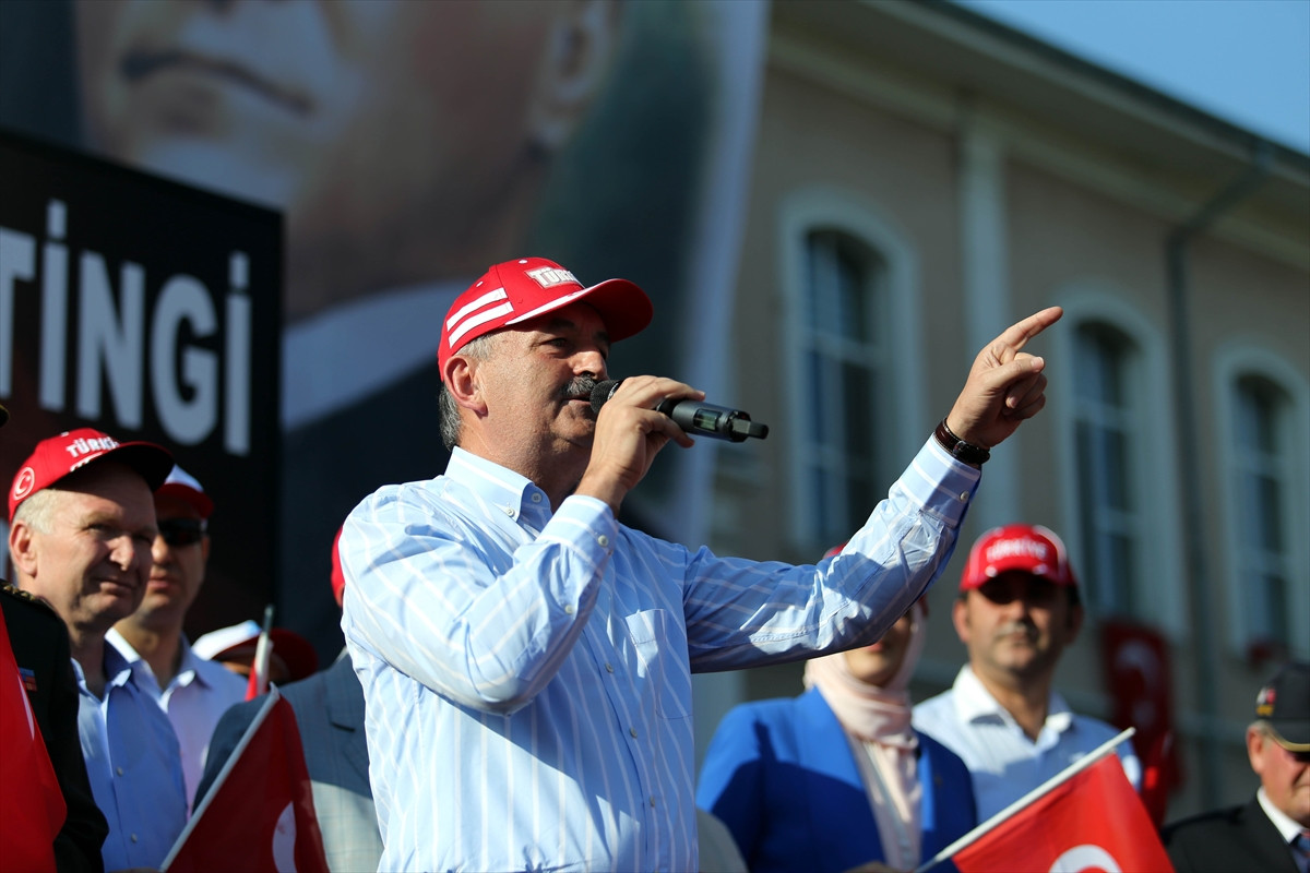 Müezzinoğlu, Tekirdağ Valiliği önünde Cumhurbaşkanlığı himayesinde İstanbul'da düzenlenen Demokrasi ve Şehitler Mitingi'ne destek vermek için toplanan vatandaşlara hitap etti.