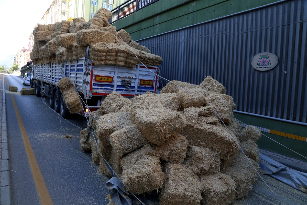 ISPARTA (AA) - Isparta'da saman yüklü tırın, alt geçidin tavanına çarpmasıyla devrilen saman balyaları, yolun kapanmasına neden oldu.