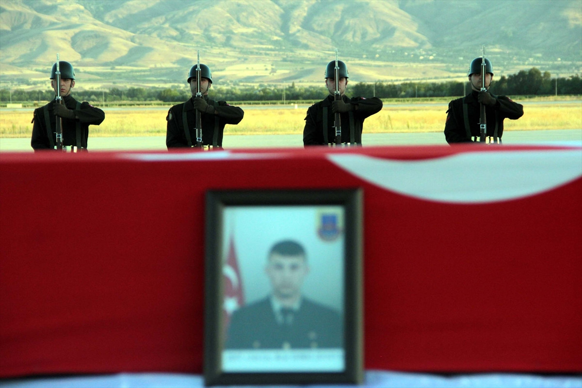 Şehit Durmaz'ın (25) Türk bayrağına sarılı naaşı, cenaze nakil aracıyla törenin düzenlendiği Elazığ Havalimanı'na getirildi. Şehidin cenazesi, meslektaşlarının omuzlarında katafalka konuldu.