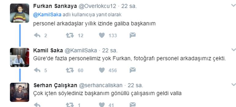 Paylaştığı fotoğrafta "Güre Hizmet Binası'nda görevli personel arkadaşlarımızdan devam eden çalışmalarımızla ilgili bilgi alıyorum" ifadelerini kullanan Kamil Saka'ya Twitter'da bir kullanıcı, fotoğrafta bir tek kendisinin görünüyor olması nedeniyle "Personel arkadaşlar yıllık izinde galiba başkanım" deyince Kamil Saka'nın verdiği yanıt gülümsetti.