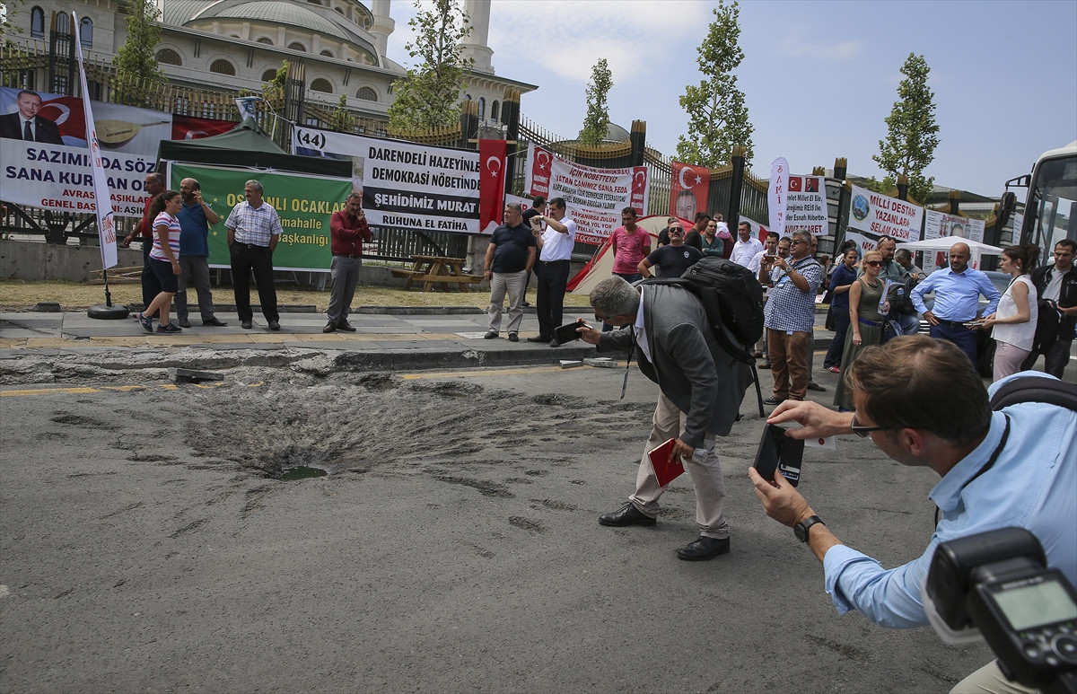 TBMM ziyareti sonrasında Cumhurbaşkanlığı Külliyesi'ne giden yabancı gazeteciler, burada "demokrasi nöbeti" tutan vatandaşları fotoğrafladı ve vatandaşlarla darbe girişimi gecesinde yaşananlara dair görüştü.