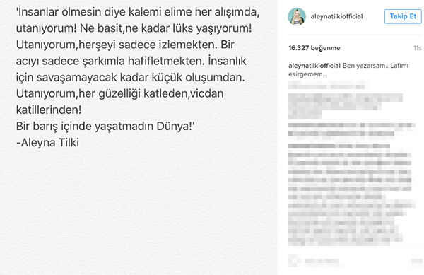 Alkollü mekanlarda konser verdiği için uzun süre Türkiye'nin gündeminde kalan 17 yaşındaki Aleyna Tilki yaşanan terör olaylarına sosyal medya hesabından tepki gösterdi..
