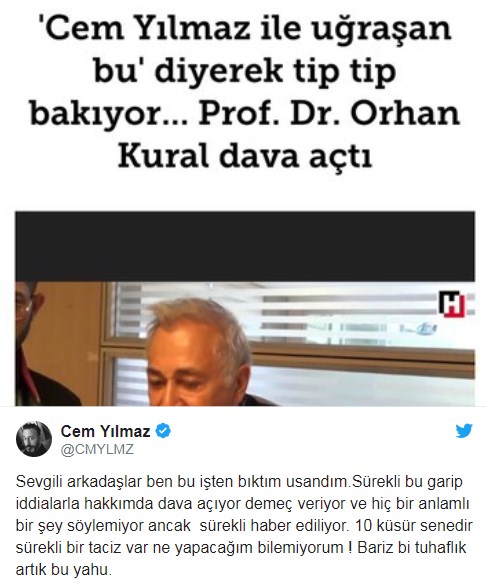 Yılmaz, Kural’la ilgili isyanını attığı tweet’le gösterdi. “Sevgili arkadaşlar ben bu işten bıktım usandım” diyen Yılmaz, “Sürekli bu garip iddialarla hakkımda dava açıyor demeç veriyor ve hiçbir anlamlı bir şey söylemiyor ancak sürekli haber ediliyor. 10 kusür senedir sürekli bir taciz var ne yapacağım bilemiyorum! Bariz bi tuhaflık artık bu yahu” yazdı.