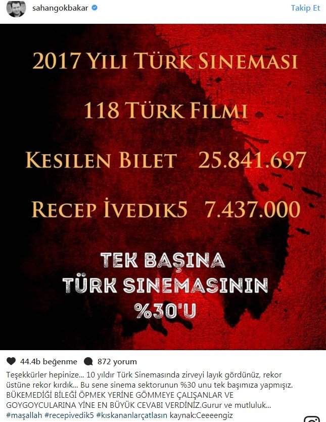Bu yıl 118 Türk filminin vizyona girdiğini belirten komedyen, 25 milyonun üzerinde kesilen biletin yaklaşık 7 buçuk milyonunun Recep İvedik 5'e ait olduğunu işaret etti. 'Recep İvedik' ile Türk sinemasının tek başına yüzde 30'nu elinde bulundurduğunu dile getiren Gökbakar, Yılmaz'a da manidar bir gönderme yaptı. "Bükemediği bileği öpmek yerine gömmeye çalışanlar ve goygoycularına en büyük cevabı verdiniz" diyen Gökbakar'ın bu sözleri yeni bir polemiğin fitilini ateşleyecek...