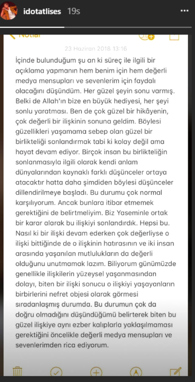 "İçinde bulunduğum şu anki süreç ile ilgili bir açıklama yapmanın hem benim için hem değerli medya mensupları ve sevenlerim için faydalı olacağını düşündüm. Her güzel şeyin sonu varmış. Belki de Allah'ın bize en büyük hediyesi, her şeyi sonlu yaratması. Ben de çok güzel bir hikayenin çok değerli bir ilişkinin sonuna geldim. Böylesi güzellikleri yaşamama sebep olan güzel bir birlikteliği sonlandırmak tabi ki kolay değil ama hayat devam ediyor. Birçok insan bu birlikteliğin sonlanmasıyla ilgili olarak kendi anlam dünyalarından kaynaklı farklı düşünceler ortaya atacaktır hatta daha şimdiden böylesi düşünceler dillendirilmeye başlandı. Bu durumu çok normal karşılıyorum. Ancak bunlara itibar etmemek gerektiğini de belirtmeliyim.