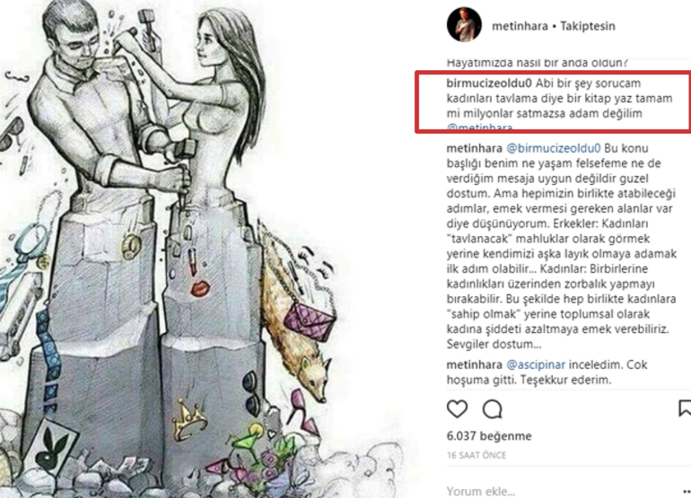 Takipçisinin bu önerisine kızan Metin Hara, şu şekilde cevap verdi "Bu konu başlığı benim ne yaşam felsefeme ne de verdiğim mesaja uygun değildir güzel dostum. Ama hepimizin birlikte atabileceği adımlar, emek vermesi gereken alanlar var diye düşünüyorum. Erkekler: Kadınları "tavlanacak" mahluklar olarak görmek yerine kendimizi aşka layık olmaya adamak ilk adım olabilir... Kadınlar: Birbirlerine kadınlıkları üzerinden zorbalık yapmayı bırakabilir. Bu şekilde hep birlikte kadınlara "sahip olmak" yerine toplumsal olarak kadına şiddeti azaltmaya emek verebiliriz. Sevgiler dostum... "