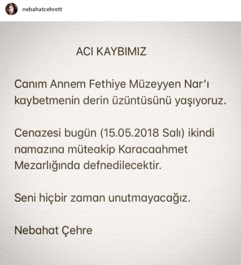 Ünlü oyuncu Nebahat Çehre sosyal medya hesabında acı haberi takipçileri ile paylaştı: