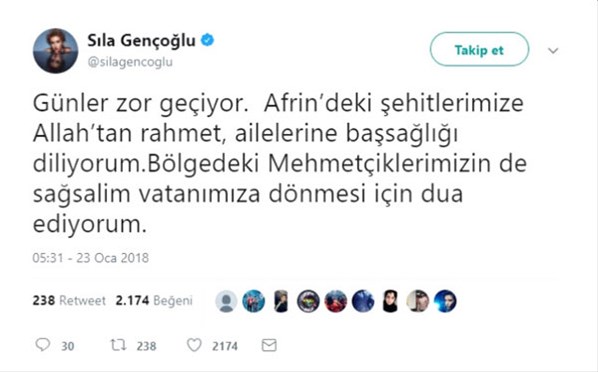 Sıla, Twitter hesabından şu açıklamayı yaptı: "Günler zor geçiyor. Afrin'deki şehitlerimize Allah'tan rahmet, ailelerine başsağlığı diliyorum. Bölgedeki Mehmetçiklerimizin de sağsalim vatanımıza dönmesi için dua ediyorum."