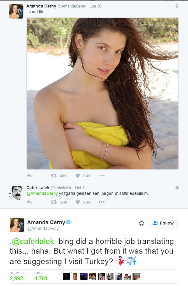 25 yaşındaki ABD’li Snapchat yıldızı Amanda Cerny, ‘Ada hayatı’ yazdığı seksi bir pozunu Twitter’dan paylaştı. Pek çok takipçisinden beğeni alan Cerny’ye Türkiye’den Cafer Lalek adında bir Twitter kullanıcısı yanıt yazdı. ‘Yozgada gelirsen seni bir gün misafir edebilirim’ yazan kullanıcıya Cerny’den cevap geldi: ‘Bing çok kötü bir çeviri yaptı, hahaha. Ama anladığım kadarıyla Türkiye’yi ziyaret etmem gerektiğini söylüyorsun’.