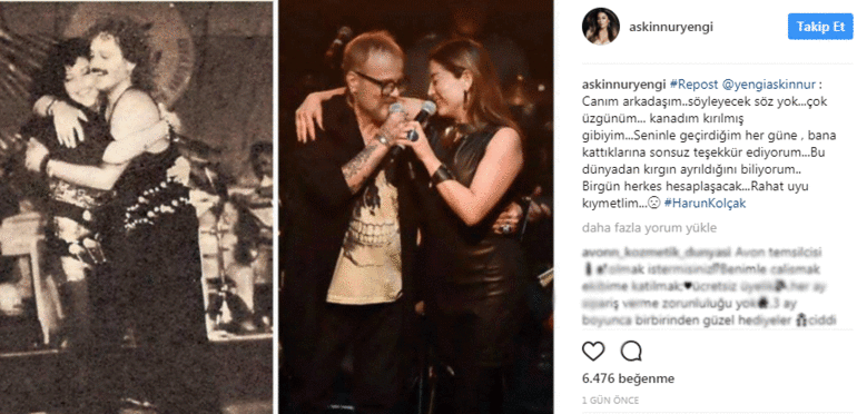 Aşkın Nur Yengi uzun yıllardır dost olduğu Harun Kolçak'ı kaybettikten sonraki duygularını takipçileriyle paylaştı. Acısını, "Canım arkadaşım..söyleyecek söz yok...çok üzgünüm... kanadım kırılmış gibiyim...Seninle geçirdiğim her güne , bana kattıklarına sonsuz teşekkür ediyorum...Bu dünyadan kırgın ayrıldığını biliyorum.. Bir gün herkes hesaplaşacak...Rahat uyu kıymetlim..." sözleriyle dile getiren Aşkın Nur Yengi'nin takipçileri de sanatçının üzüntüsünü paylaştı.