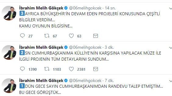 Gökçek twitter hesabından yaptığı açıklamada, ''Dün gece Sayın Cumhurbaşkanımdan randevu talep etmiştim. Bu gece görüştük. Sayın Cumhurbaşkanıma Külliye'nin karşısına yapılacak müze ile ilgili projenin tüm detaylarını sundum. Ayrıca Büyükşehir'in devam eden projeleri konusunda çeşitli bilgiler verdim. Kamuoyunun bilgisine'' ifadelerini kullandı.
