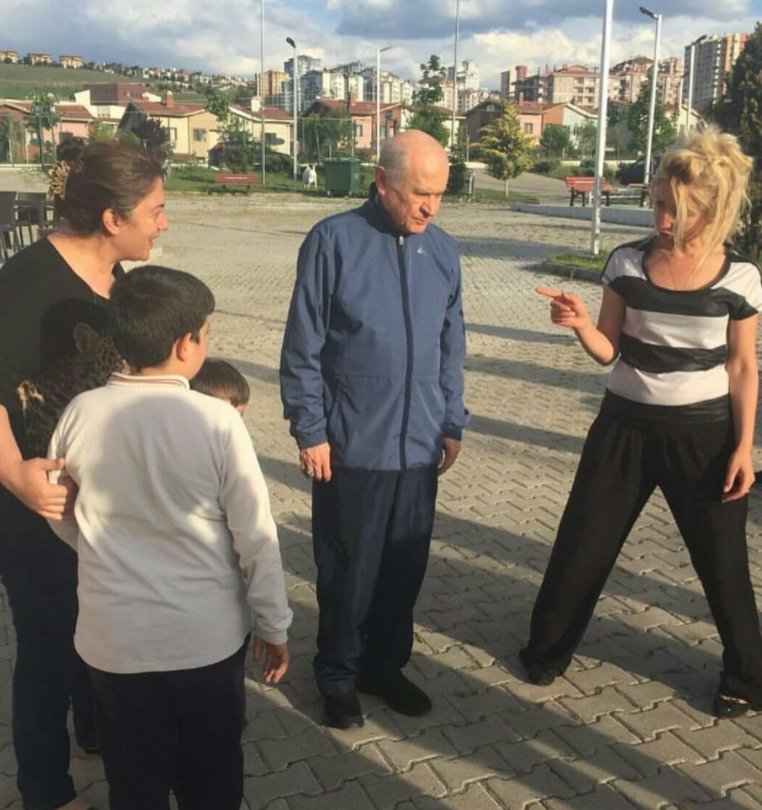 Lacıvert pantalon, mavi beyaz bir ceket ile mavi kravatla objektiflere poz veren MHPLideri, bu kez de eşofmanla görüntülendi.
