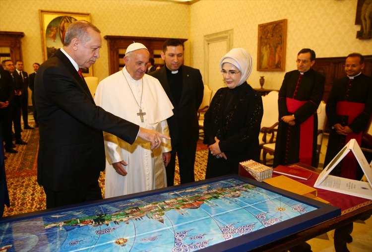 Erdoğan, Papa'ya eski İstanbul'u 24 parçada tasvir eden minyatür İznik çinisi ile Mesnevi'nin İtalyanca ve İngilizce baskılarını hediye etti. Papa da Cumhurbaşkanı Erdoğan'a barışı simgeleyen madalyon takdiminde bulundu.Erdoğan ve Papa, sunulan hediyeler hakkında birbirlerine bilgi verdi.