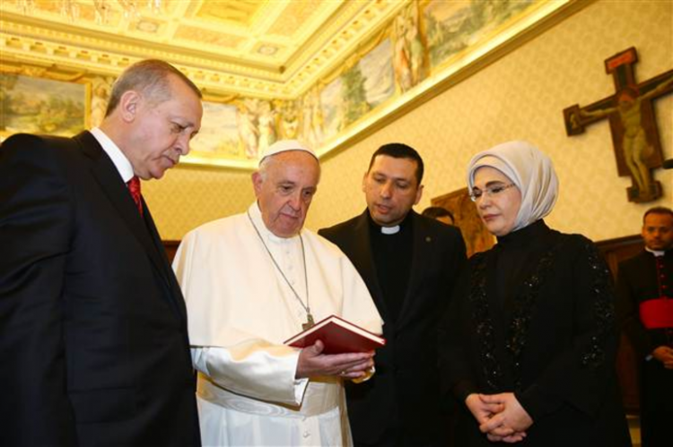 Papa, Apostol Sarayı'nda, konuklarını ağırladığı Kütüphane Salonu'ndaki görüşme öncesinde Cumhurbaşkanı Erdoğan'ı kapıda karşıladı. İtalyanca "Buongiorno" diyen Papa'ya, Cumhurbaşkanı Erdoğan da "How are you" sözleriyle karşılık verdi. "Gösterdiğiniz ilgi için çok teşekkür ederim" ifadesini kullanan Cumhurbaşkanı Erdoğan'a, Papa da ziyaretinden dolayı teşekkürlerini iletti.Daha sonra Cumhurbaşkanı Erdoğan ve Papa Françesko, basın mensupları önünde el sıkışarak, görüşmenin yapıldığı Kütüphane Salonu'na geçti.
