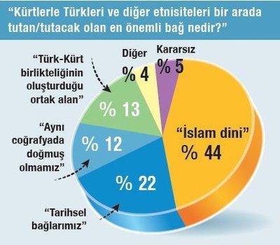 "Kendinizi hangi etnisite mensubu sayıyorsunuz?" sorusuna ise yüzde 43 "Türk", yüzde 41"Kürt", yüzde 5 "Arap", yüzde 5 "Zaza" yanıtı çıktı. "Kürt olduğunuz için Türk ya da Türk olduğunuz için Kürt vatandaştan size tahkir edici, aşağılayıcı bir davranışla karşılaştınız ya da karşılaşma endişeniz var mı?" yönündeki soruya ise yüzde 82 oranında "hayır" yanıtı verildi.