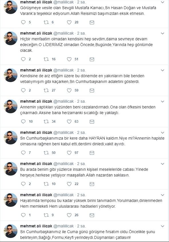 Görüşmeye ilişkin detayları paylaşan Ilıcak, "Cumhurbaşkanımıza bir kere daha hayran kaldım. Niye mi? Annemin hapiste olmasına rağmen, beni kabul etti, derdimi dinledi, vakit ayırdı. Annemin yaptıkları yüzünden beni cezalandırmadı" dedi.
