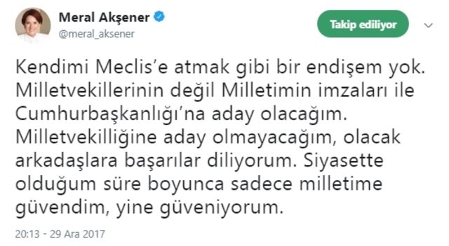 Kendimi Meclis’e atmak gibi bir endişem yok. Milletvekillerinin değil Milletimin imzaları ile Cumhurbaşkanlığı’na aday olacağım. Milletvekilliğine aday olmayacağım, olacak arkadaşlara başarılar diliyorum. Siyasette olduğum süre boyunca sadece milletime güvendim, yine güveniyorum.