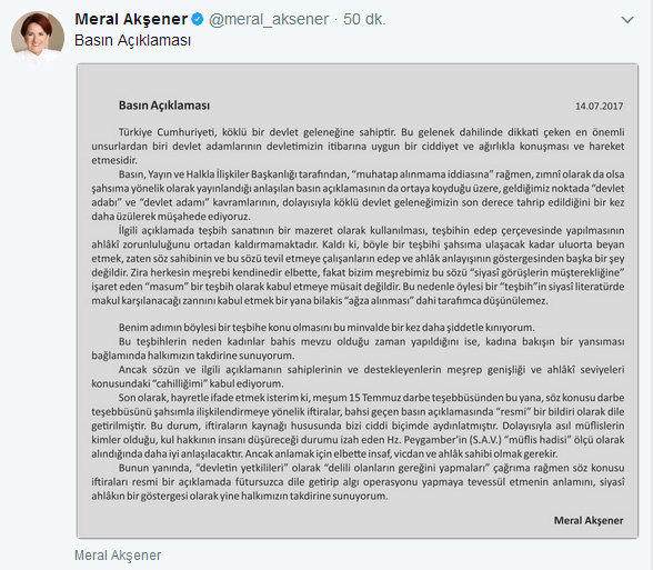 Akşener şöyle devam etti: İlgili açıklamada teşbih sanatının bir mazeret olarak kullanılması, teşbihin edep çerçevesinde yapılmasının ahlaki zorunluluğunu ortadan kaldırmaktadır. Kaldı ki, böyle bir teşbihi şahsıma ulaştıracak kadar uluorta beyan etmek, zaten söz sahibinin ve bu söz tevil etmeye çalışanların edep ve ahlak anlayışının göstergesinden başka bir şey değildir."