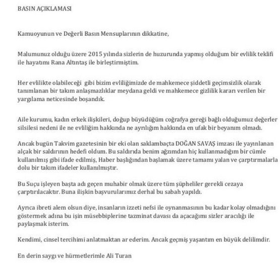 Takvim'in iddiasını göre; Ali Turan, ünlü bir şarkıcıyla aşk yaşadıktan sonra Rana Altıntaş ile tanıştı.Yaklaşık 1.5 yıl birlikte olan çift, 2015'te nikah kıydı. Boğaz manzaralı bir otelde evlenen çift, son aylarda tartışmaya başladı. İddiaya göre Ali Turan eşine "Ben artık kendimi erkek gibi hissetmiyorum" diyerek "Gay" olduğunu ve ayrılmak istediğini anlattı. Bu itiraf üzerine şoke olan genç kadın, hemen dava açtı. Hatta hakimden "Eşim gay olduğunu söyledi. Bu yönde rapor alınsın" diyerek boşanmanın buna göre kararlaştırılmasını talep etti. Ancak bu isteği, mahkeme tarafından reddedildi. Hakim, 'şiddetli geçimsizlik' nedeniyle de evliliği resmen bitirdi. Her gün yeni bir skandalın patlak verdiği renkli dünyada böyle bir nedenle boşanmanın ilk kez yaşandığı iddia edildi. Magazin aleminde herkesin dilinde olan bu boşanmanın ise bir süre önce gerçekleştiği kaydedildi.