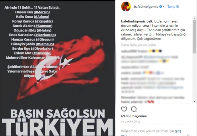 Bafetimbi Gomis, paylaşımında, "Belki bizler için hayat devam ediyor ama 11 şehidin ailesinin evine ateş düştü. Tanrı'dan şehitlerimiz için rahmet, aileleri ve tüm Türkiye'ye başsağlığı diliyorum. Çok üzgünüm." ifadelerini kullandı.