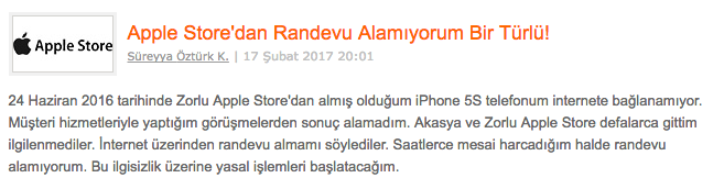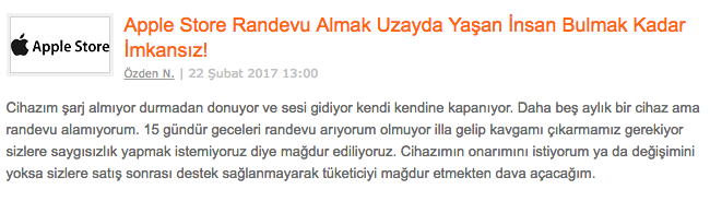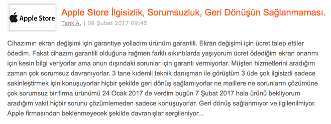 Özetle, eğer adınız X diyelim... ama iColud şifrenizi rumuzlu aldınız ve Y dediniz. Apple Store sizi kabul etmiyor. Siz sanki cihazın sahibi değilmişsiniz gibi kapı dışarı gönderiyor.... Vatandaşlar şikayet sitelerini Apple Store hakkındaki isyanları ile de böyle doldurdu: