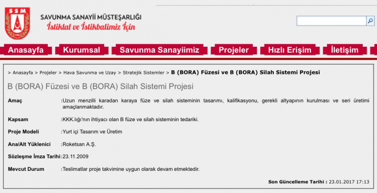 ROKETSAN tarafından üretilen ve yerli adı BORA olacak olan uzun menzilli füze sistemi 'Khan' ismiyle ilk kez ortaya çıktı. ROKETSAN İDEX-2017'de uzun menzilli füze sistemine ait broşür bir yayınladı.